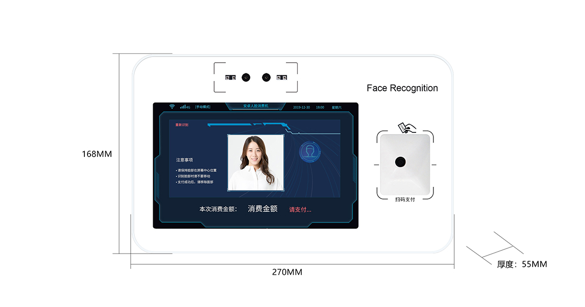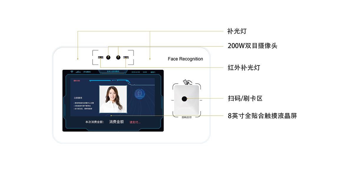 - 本機為多媒體消費終端,具有語音播報、人臉識別、人員照片顯示、操作狀態(tài)提示以及當(dāng)前狀態(tài)指示等功能。