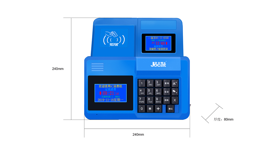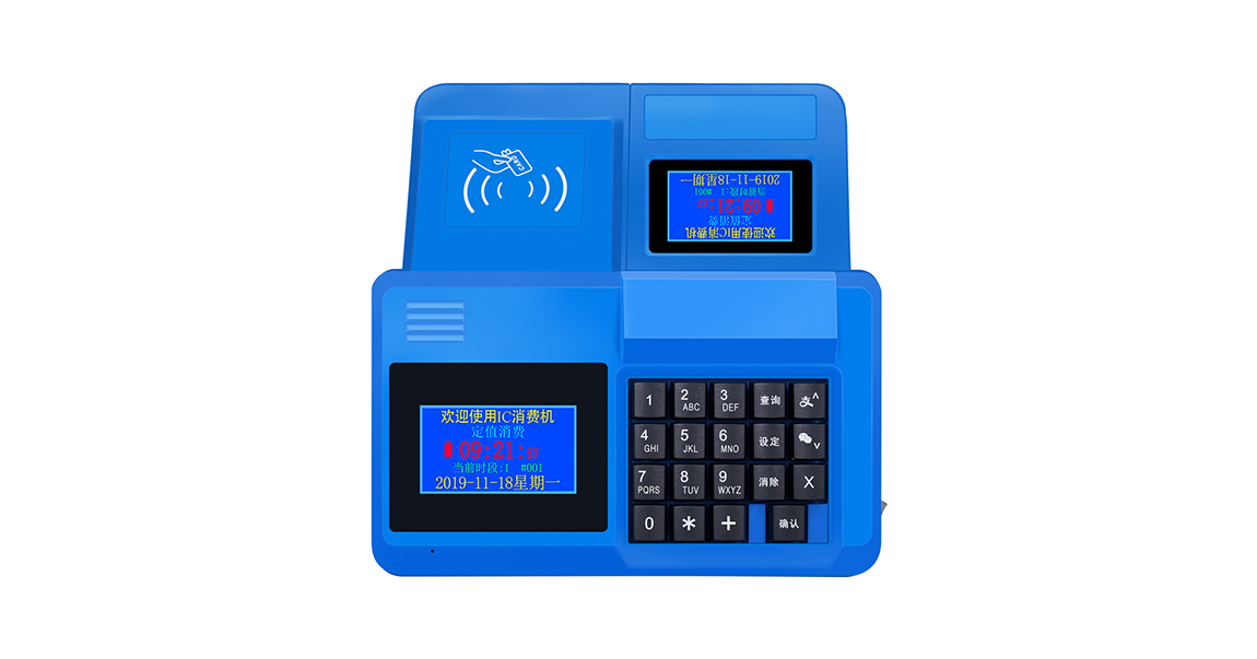消費機有兩個顯示面,一面顯示處面向就餐者,帶操作鍵盤及顯示處面向收銀員。