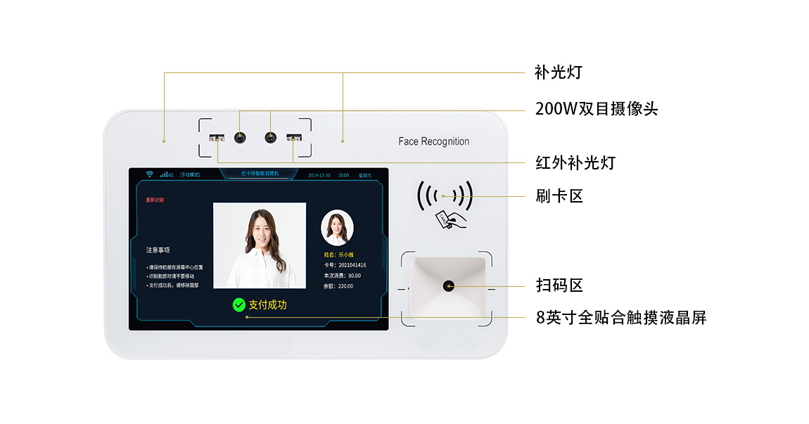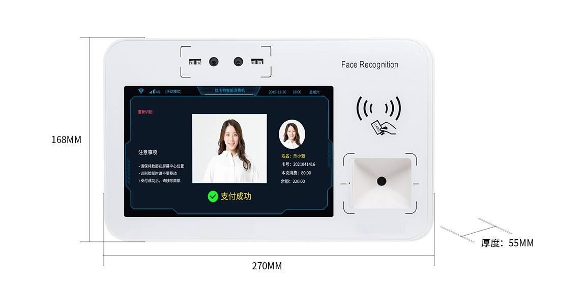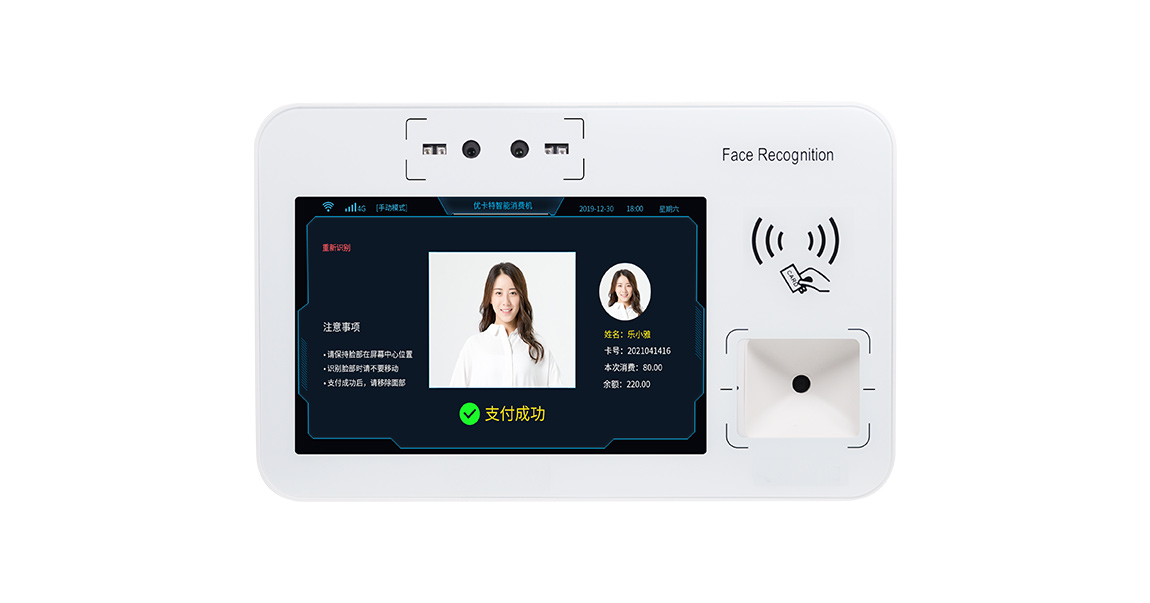 人臉識別支付終端是深圳市優(yōu)卡特電子有限公司開發(fā)的刷臉消費(fèi)設(shè)備!擁有動(dòng)態(tài)活體檢測功能,支持定制化開發(fā)。人臉支付與食堂就餐及超市購物相結(jié)合,加速食堂就餐場景流轉(zhuǎn),便捷管理,消費(fèi)信息可實(shí)時(shí)查詢,終端識別速度快,減少人工錯(cuò)誤、提高了打飯效率,斷網(wǎng)離線可用。