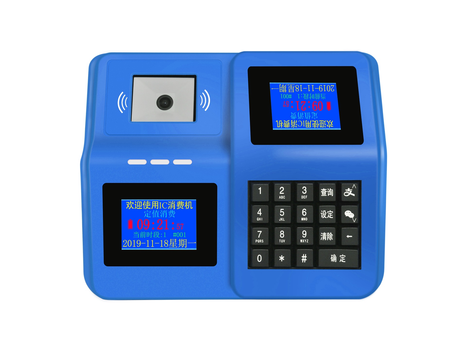 消費機有兩個顯示面,一面顯示處面向就餐者,帶操作鍵盤及顯示處面向收銀員。